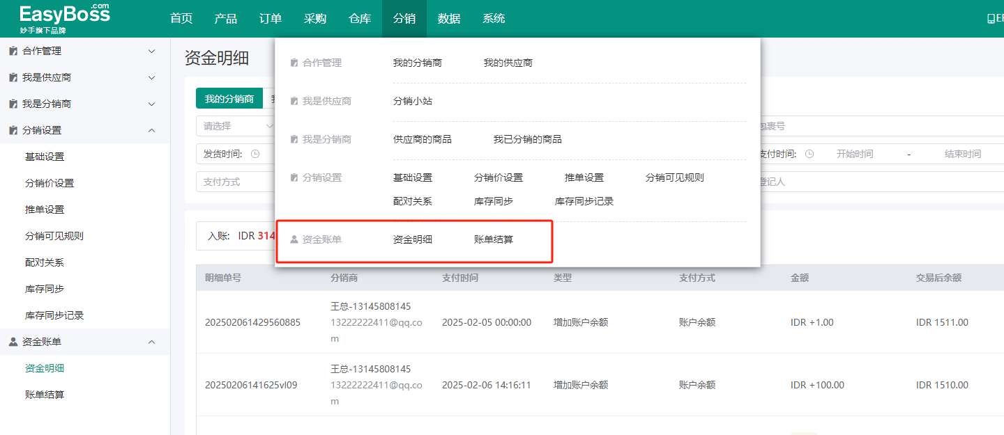 4、可在分销功能中,查看分销商流水明细、操作定期结算功能