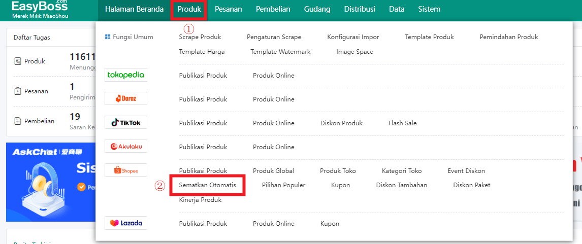 1.Klik [Produk] => [Sematan Otomatis] Platform Shopee
