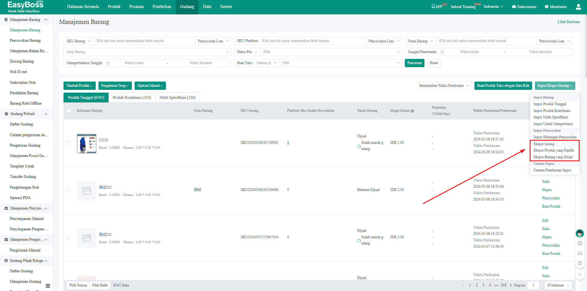 Ekspor barang yang dicari, artinya mengekspor semua hasil pencarian, jika ada 100 informasi produk di hasil pencarian, semuanya diekspor.