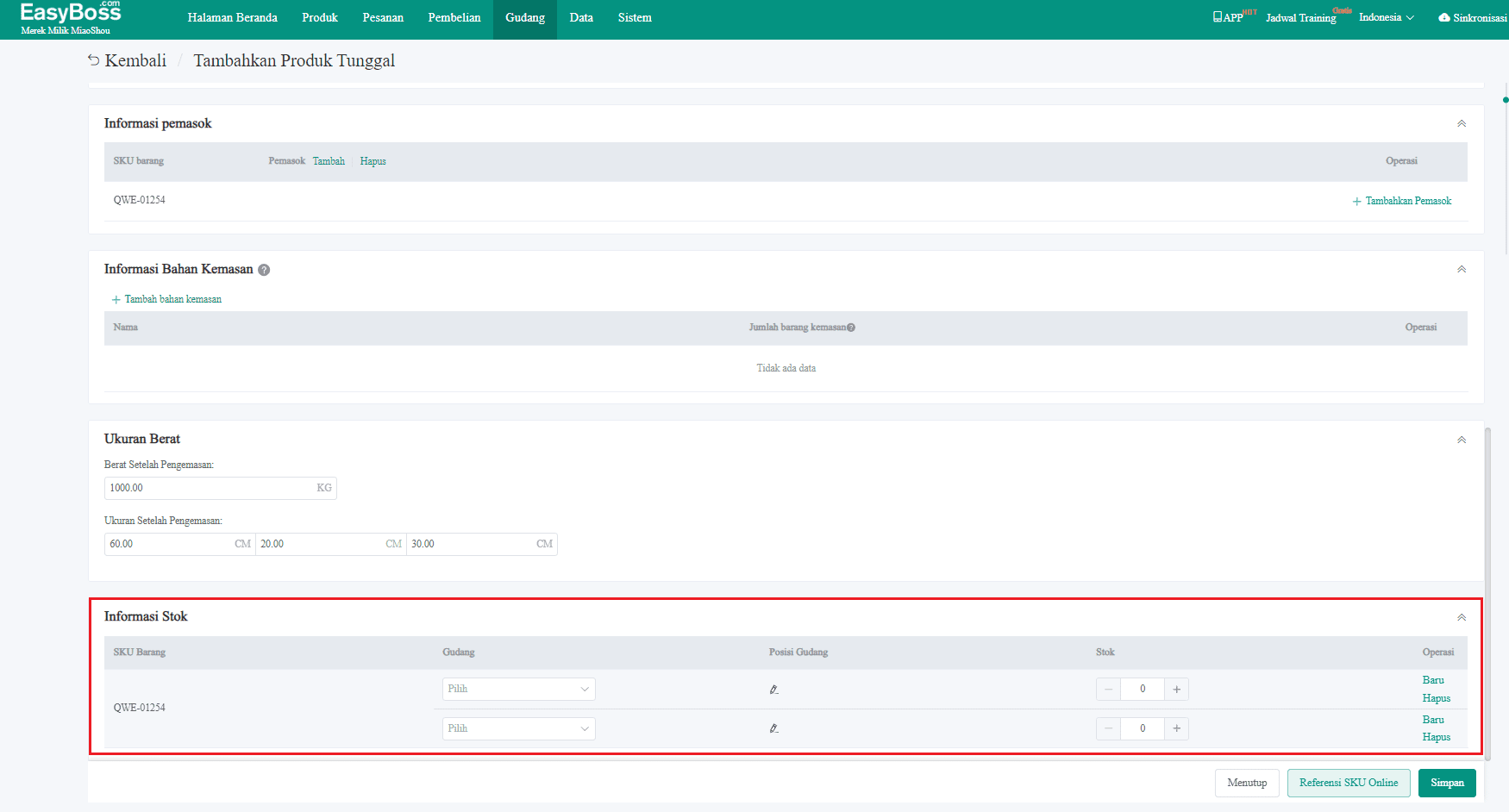 Saat membuat perlu barang pilih gudang dan mengaturkan informasi stok lainnya