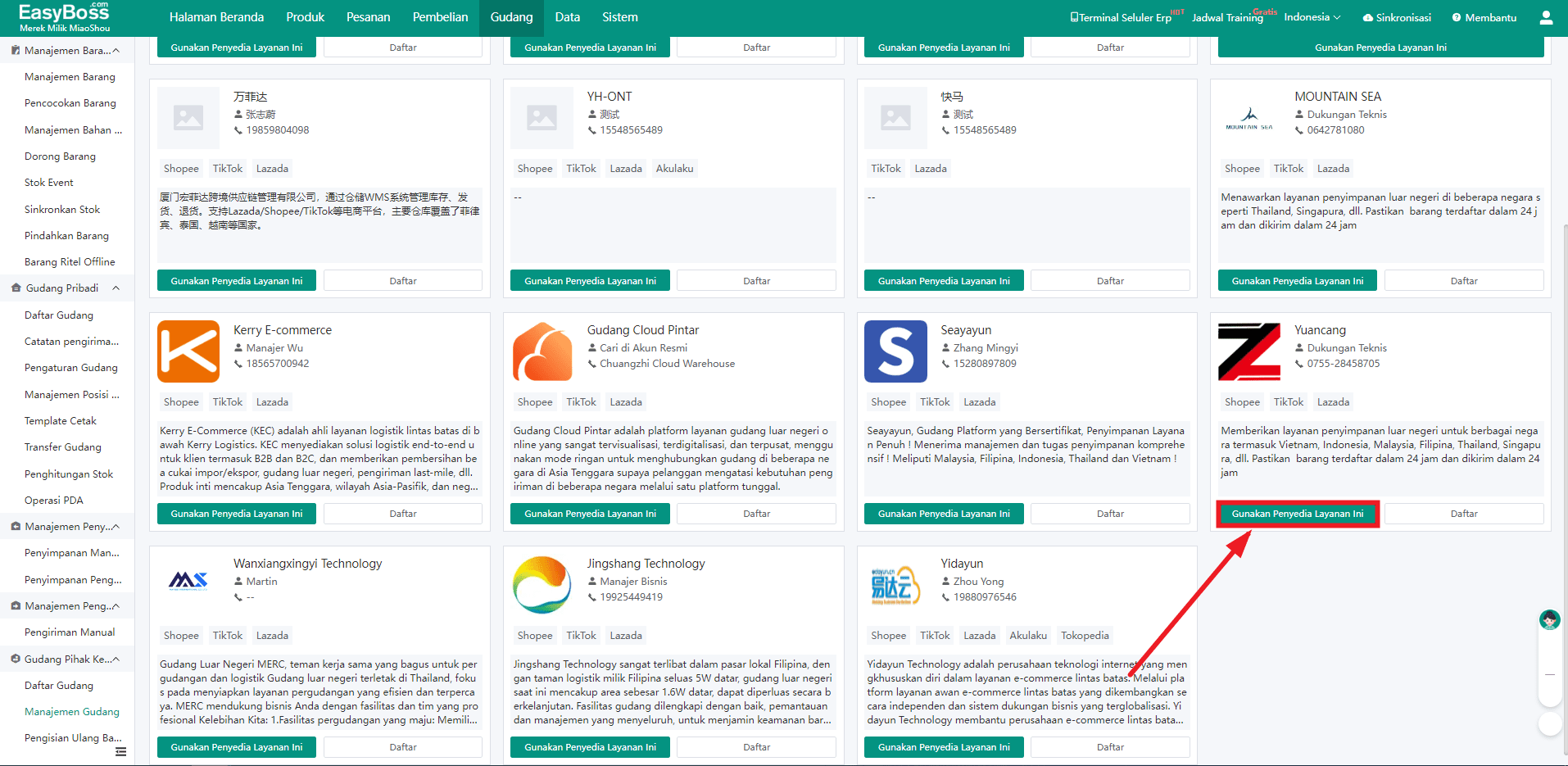 5. Setelah pendaftaran berhasil kembali ke halaman manajemen gudang EasyBoss, klik [Gunakan Penyedia Layanan Ini]